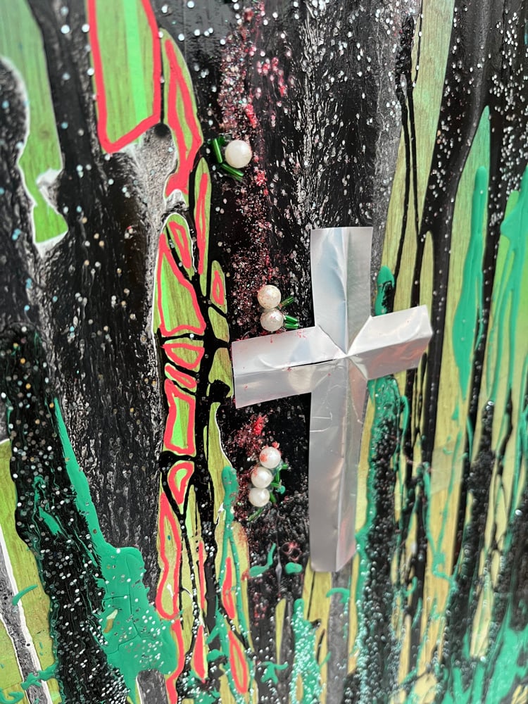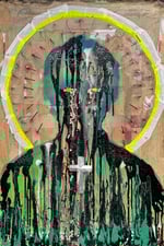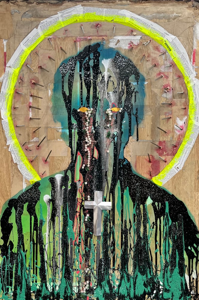 “Nail Halo” is a raw, visceral mixed-media portrait that confronts the viewer with the collision between faith, pain, and personal reclamation. At the centre stands a silhouetted figure formed through cascading drips of black, green, teal, and white paint—an almost melting presence that feels both fragile and defiant. The face appears partially obscured or dissolved, giving the figure a haunting anonymity that invites projection and memory.